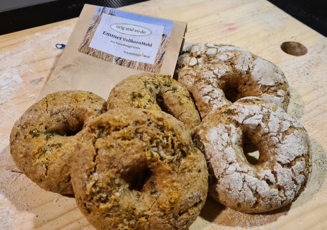 - Vorteig, Emmer Vollkornmehl, Salz, Sauerteig und Hefe in eine Schüssel geben