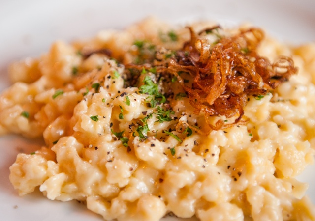 Abwechlungsweise geben Sie dann je eine Schicht Spätzle und eine Schicht würzige, geriebene Käsemischung in eine Schüssel, wobei die oberste Schicht eine Spätzleschicht sein muß. Währenddessen rösten Sie mit genügend Butter geschnittene Zwiebel an und geben diese zuletzt über die Spätzle.